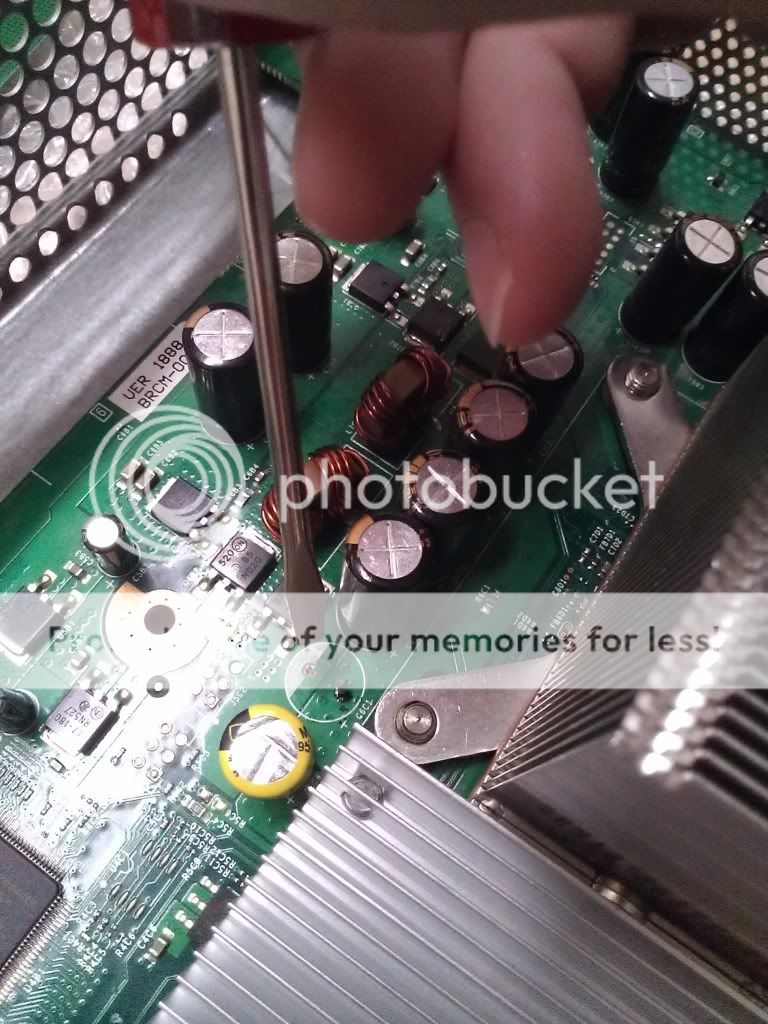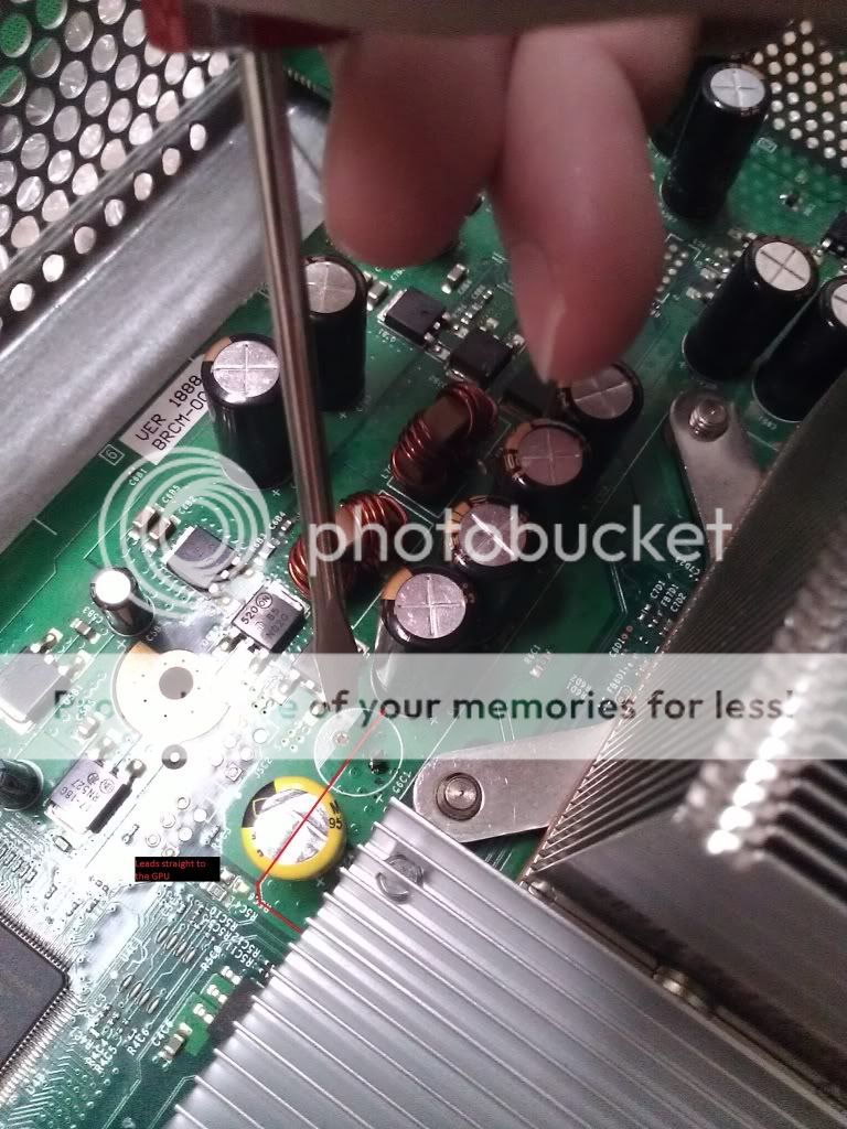 Where my screwdriver is pointing, was a 820uF 4V Fujitsu RE Aluminum solid Capacitor (exactly like the one to the immediate left). It had dark (burnt) gew-like substance at the bottom, you can still see a little after I cleaned it to the east-most pin. Does this mean it is blown? I have RROD 0020 and I pray to God this is the reason.