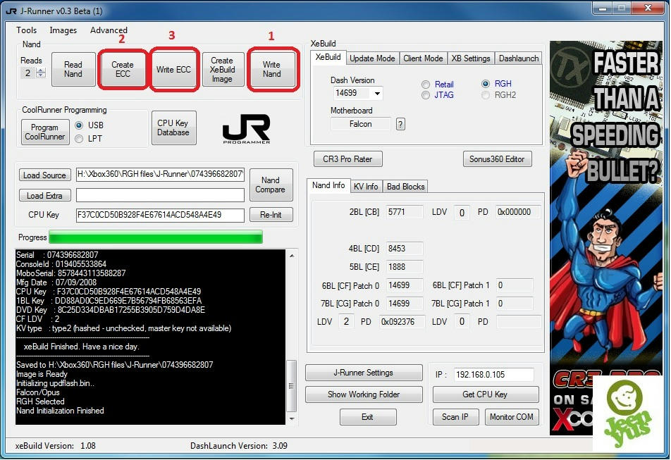 - Wait until J-Runner is finish writing the nand and select your "hack type" then click on "Create ECC" for rgh machine or "Create Xell-Reloaded" for JTAG/R-JTAG machine.