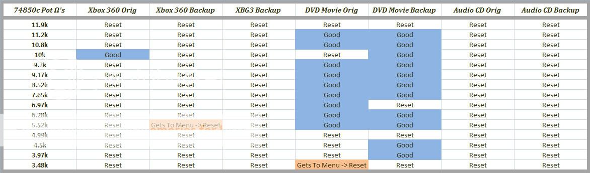 - And finally; POT TWEAK: Tried between 8.5kOhm & 4.0kOhm; at 7.8kOhm the DVD movie played FINE; even after it got to the main menu.